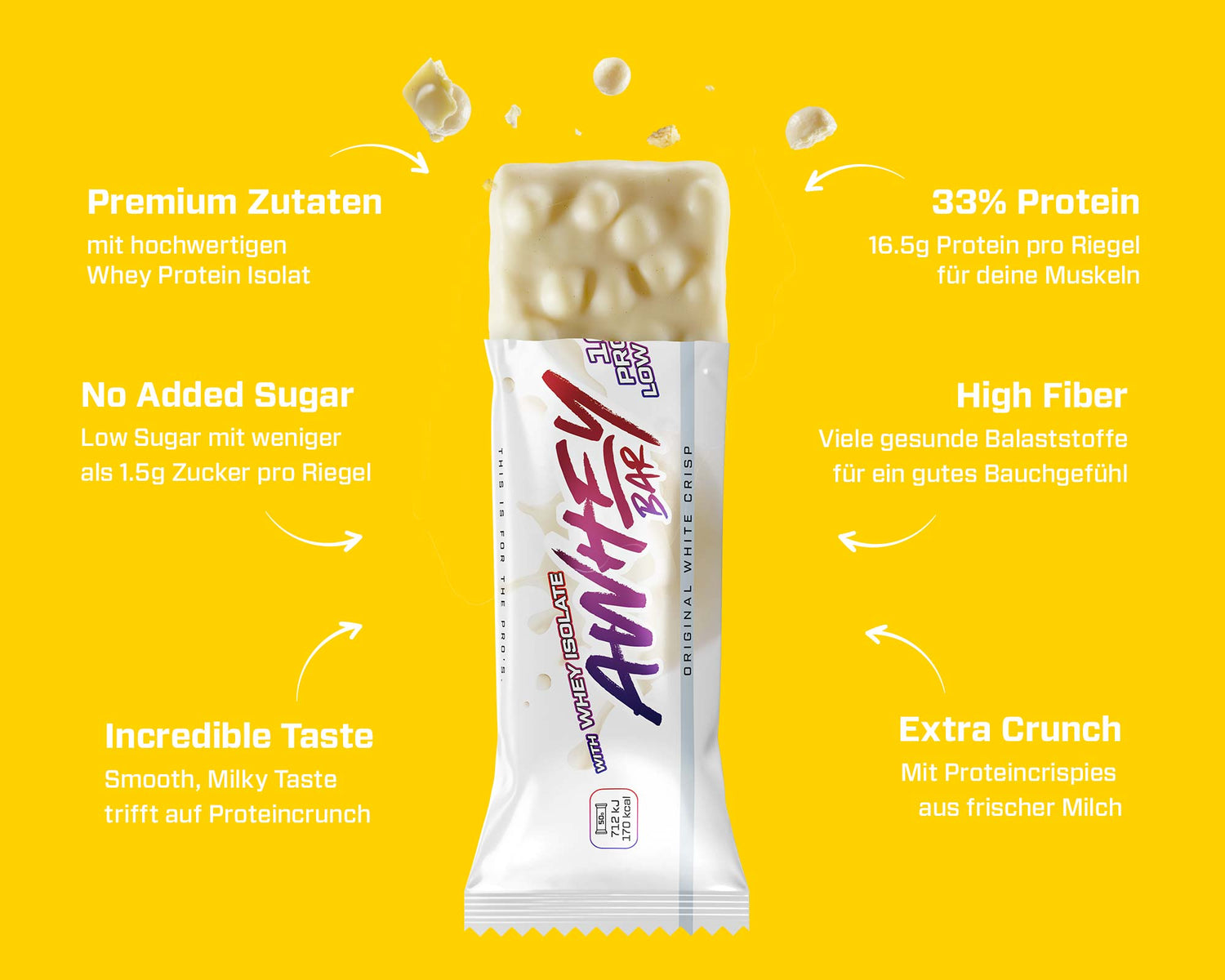 Leistungsstarke 33% Protein aus reinstem Whey-Isolat und Caseinprotein, kombiniert mit knusprigen Milch-Proteincrispies, liefert sie dir einen unwiderstehlichen Mix aus Geschmack und Crunch – und dazu einen effektiven Proteinboost für deine Muskeln.