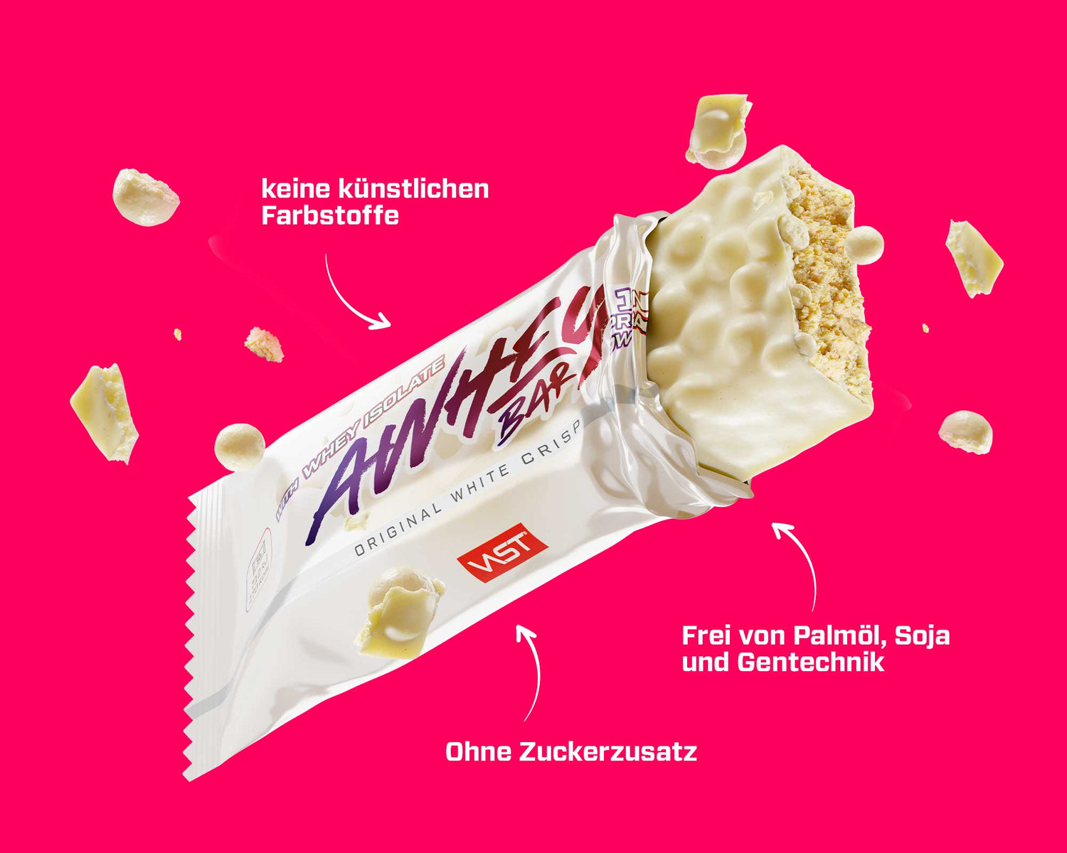 Inhaltsstoffe: Milcheiweiß (Molkeneiweiß-Isolat, Calciumcaseinat), Weiße Maltit-Schokolade (20,0%) (Süßungsmittel (Maltit), Kakaobutter, Vollmilchpulver, Emulgator (Lecithine), Aroma), Feuchthaltemittel (Glycerin), Kollagen-Hydrolysat , Tapioka Syrup, Fructo-Oligosaccharide, Füllstoff (Polydextrose), ganz gehärtetes Kokosöl, Milcheiweiß Crispies (2,5%) (Milcheiweißkonzentrat, Reismehl, Salz), Aroma, Emulgator (Lecithine), Antioxidationsmittel (Alpha-Tocopherol), Süßungsmittel (Steviolglycoside aus Stevia, Sucralose).