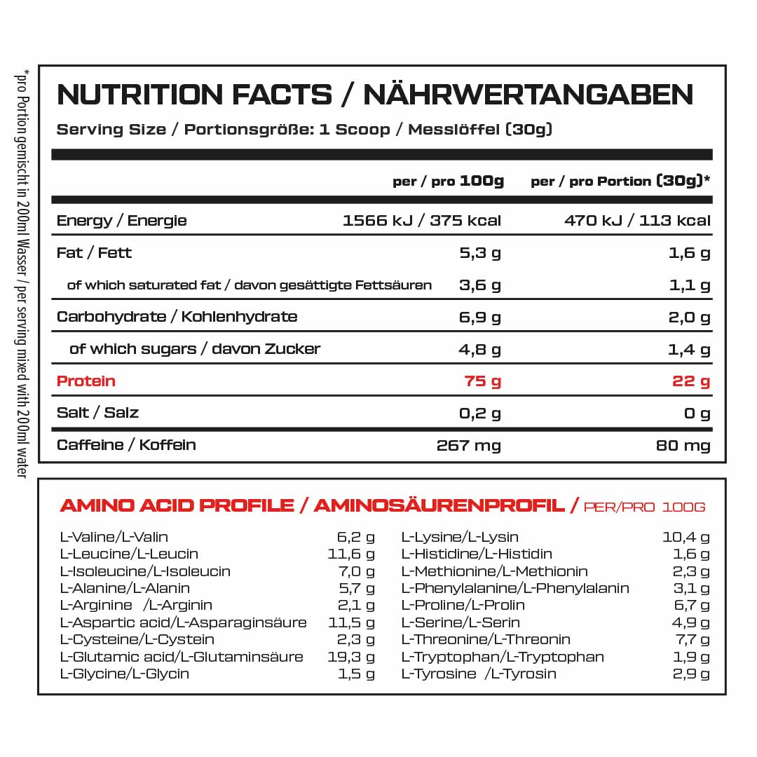 - 75 % Proteingehalt – über 22g Protein pro Portion